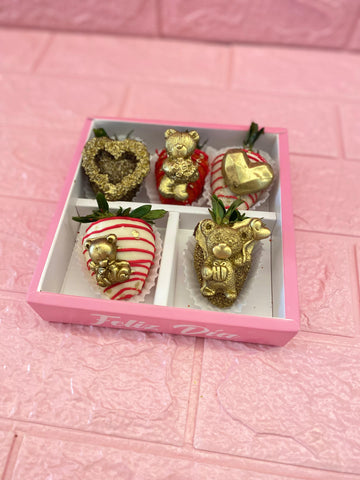 Contiene 5 fresas, puedes elegir el color de la decoración y acorde a la disponibilidad la temática.